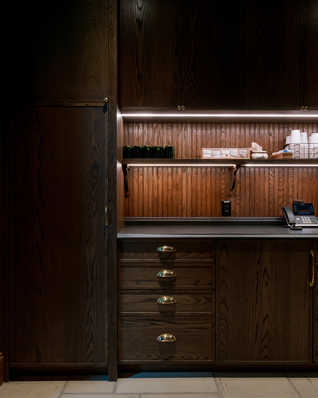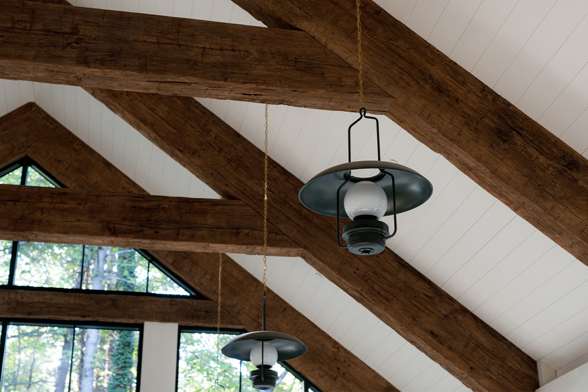 Thoughtfully sited to blend with the landscape, the structure opens the viewshed to the forest while maintaining a sense of intimacy and calm. A simple palette of materials – including natural stone, warm lap siding, and expansive glass – creates harmony between the building and its surroundings. Inside, designed in collaboration with Norris Studio, rustic wood beams, soft accent lighting, and stone-look pavers set a welcoming tone. Padded wall coverings provide both acoustic comfort and a sense of quiet sophistication, making the Meeting House a true extension of RT Lodge’s refined yet relaxed atmosphere.