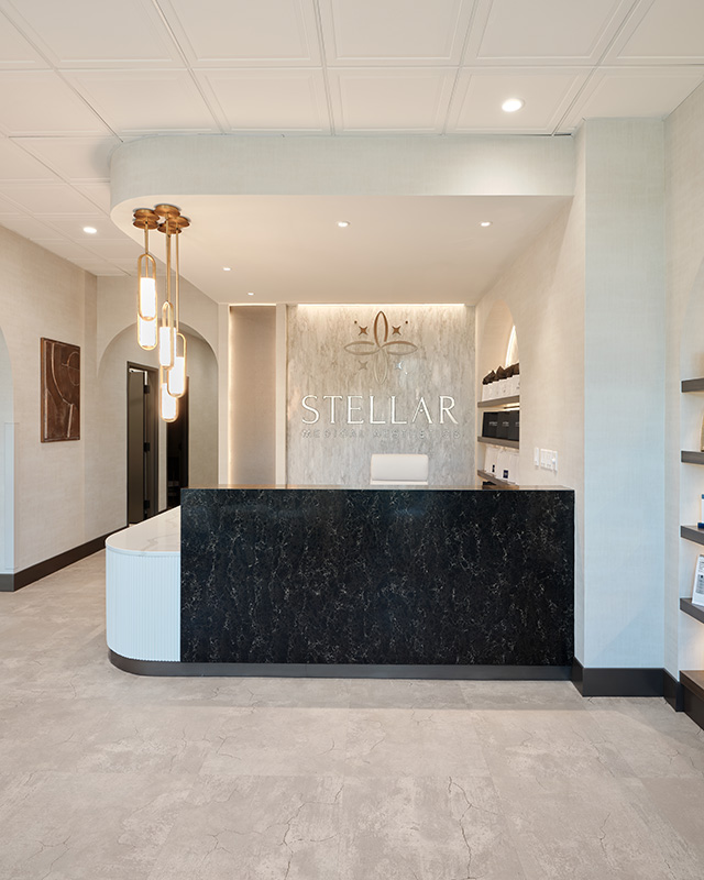 JAI partnered with Stellar Medical Aesthetics to transform a tenant suite into a refined, modern environment that supports its expanding med-spa practice. The renovation reimagines the existing space to include a welcoming lobby, patient lounge, administrative office, and six state-of-the-art treatment rooms, each designed to balance functionality with an elevated client experience.