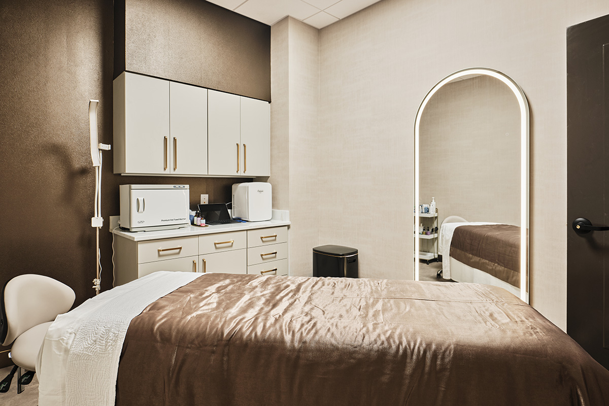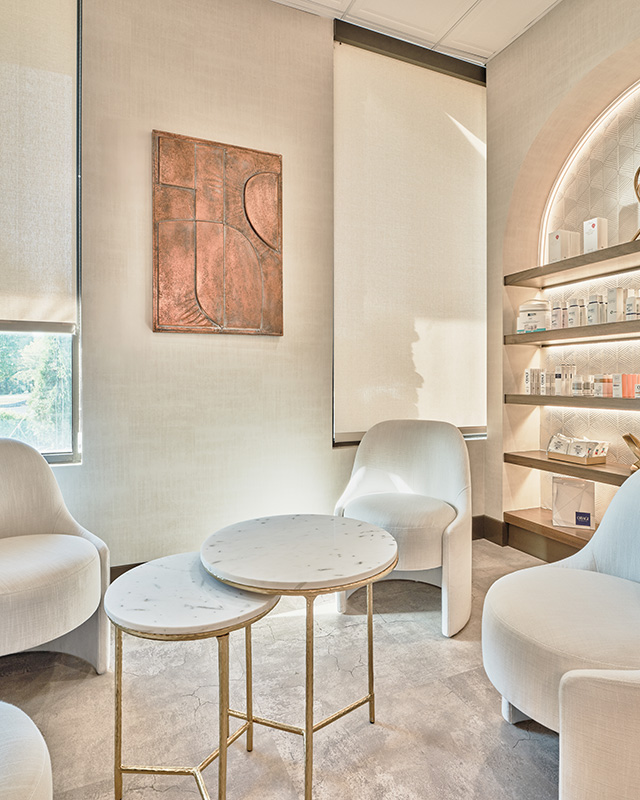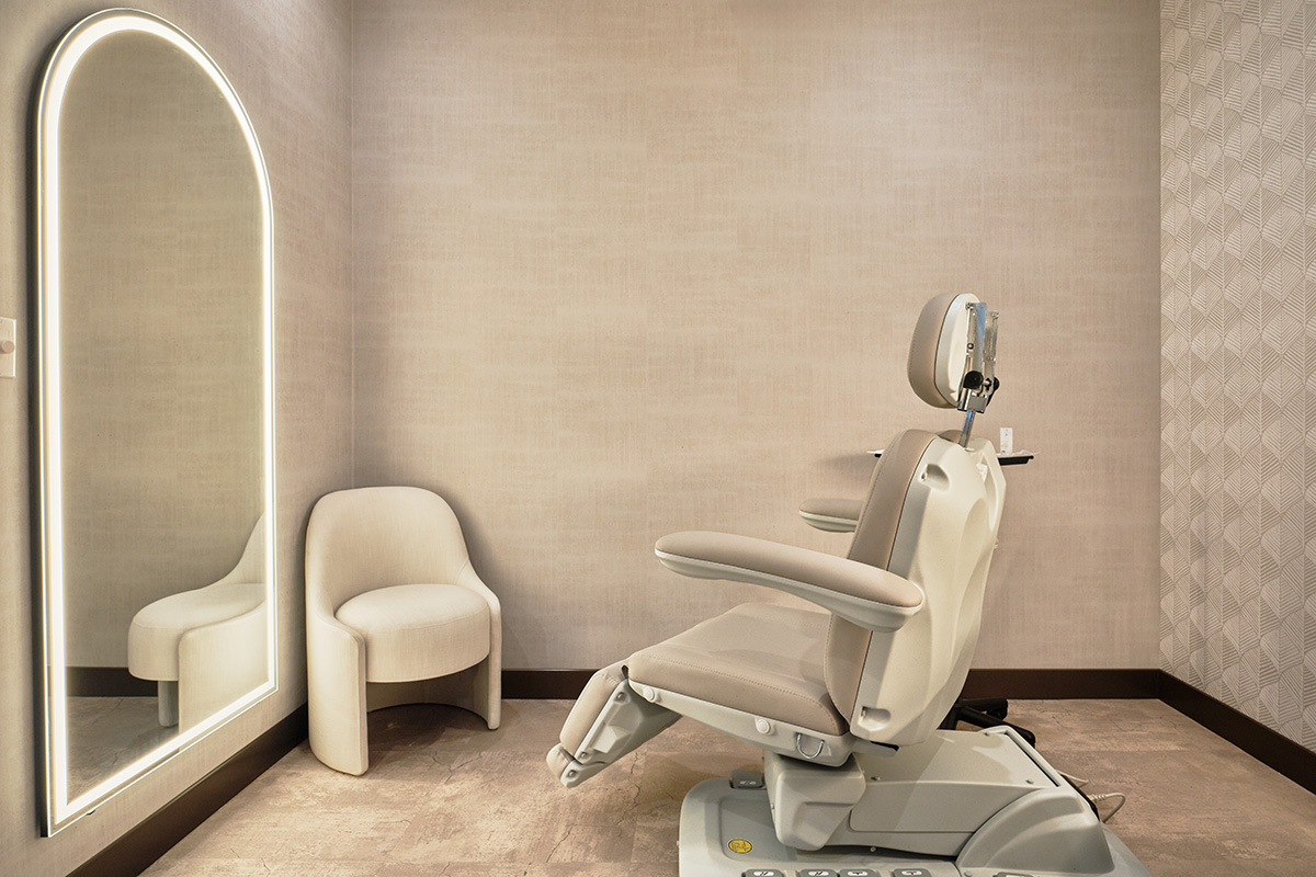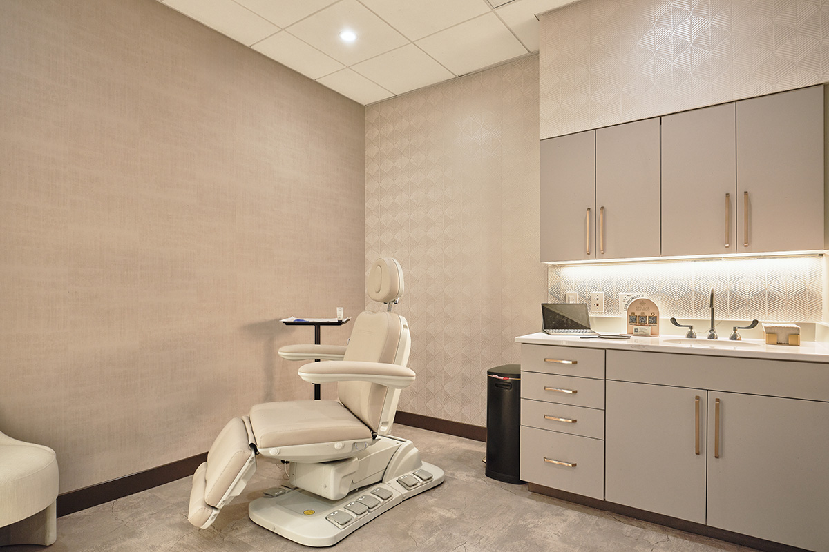 The design emphasizes clean lines, soft lighting, and thoughtful detailing. The reception area creates a striking first impression, with a dramatic quartz-clad wall and skincare offerings on custom millwork shelving that is illuminated by graceful archway lighting. Each treatment room features custom casework tailored to the practice’s workflow and aesthetic preferences.